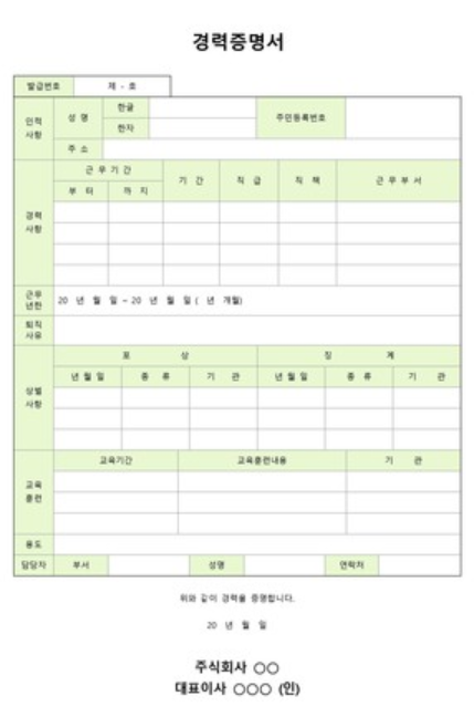 * 유효기간: 일부 기업에서는 경력증명서의 유효기간을 정해두는 경우가 있습니다. 보통 1~3개월 정도이며, 이 기간이 지난 증명서는 인정되지 않을 수 있으니 미리 확인하시는 게 좋습니다.
