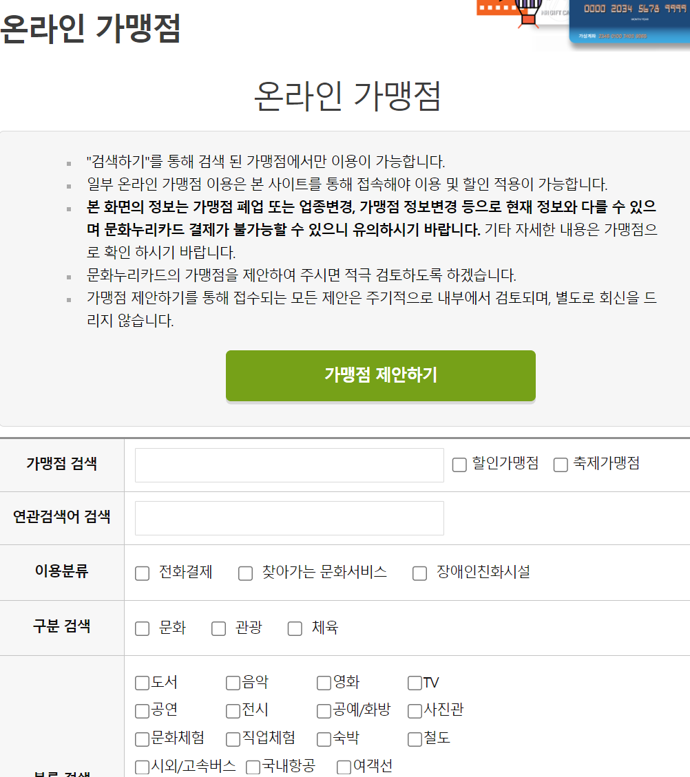 문화누리카드 온라인 사용처 이용 시 유의사항이 있습니다. 몇몇 온라인 가맹점에서는 문화누리카드 홈페이지를 통해서만 결제 및 할인이 가능합니다. 가게가 문을 닫거나, 업종을 바꾸거나, 정보가 변경될 수 있습니다. 그러므로 실제로 방문하기 전에 꼭 확인하시기 바랍니다.