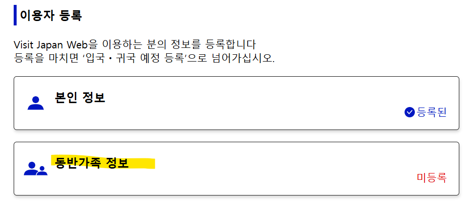 비짓 재팬 웹에서는 가족과 함께 입국할 경우 동반가족 등록 기능을 제공합니다. 아래 방법을 참고하여 동반가족 등록을 진행하세요.