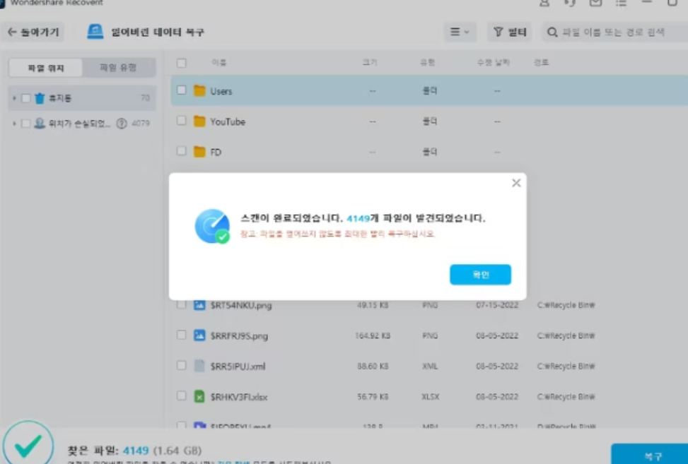 이제 본격적으로 휴지통 삭제 파일 복원이 가능한 단계입니다. 복구 파일 미리 보기가 가능하기 때문에 필요한 파일들만 복구하는 것도 가능합니다. 이후 복구 버튼을 선택하여 파일도 선택한 다음 휴지통 삭제 파일 복원을 하실 수 있습니다.