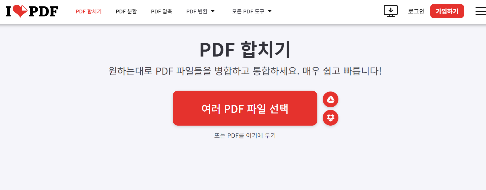 PDF 파일 합치기 사이트 중 무료로 이용 가능한 아이 러브 PDF는 온라인상에서 PDF 파일을 편집, 변환, 합치기 등 다양한 작업을 할 수 있는 유용한 서비스입니다. 여러 PDF 작업을 지원하며, 그중에서도 PDF 파일 병합하기가 쉽습니다.
